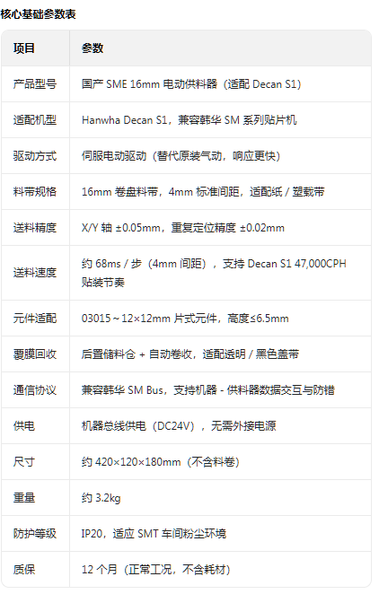 • 應用場景:消費電子、工控板等中速量產線,適配 0402/0603 電阻電容、小型 IC 等 16mm 卷盤物料。