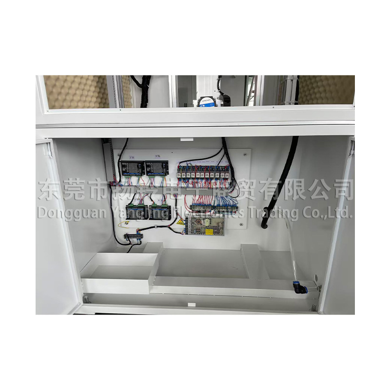 工作時幹冰在刀片切割下通過冰倉料鬥落到出冰口的上方,電機帶動出冰軸轉 動,幹冰被帶到下層一個相對封閉的空間,經由高壓空氣吹出,幹冰在噴嘴的約束下形 成各種射流形狀。噴射到待清潔物體表麵,達到清潔目的。噴射的射流形狀及射流強度 可由待清潔物表麵的形狀、汙漬的牢固度等因素決定。清潔物依據以上因素調換噴射嘴 的大小、槍嘴形狀並調節電機轉速,進氣壓力等。調節電機轉速可相應調節出冰量大小。通常汙漬越多越牢固需要電機轉速越大,具體調節量根據實際情況確定。本機器具備4軸運動功能,包括X軸,Y軸,Z軸,和A軸,分別負責幹冰噴嘴的橫向,縱向,上下運動以及PCB板的旋轉運動。運動路徑可通過控製器的編程來實現任意路徑,同時配置了安全門用來作為防護功能和隔音功能,同時具有抽風吸氣功能,可將廢氣抽出排至工廠的排氣管道中。